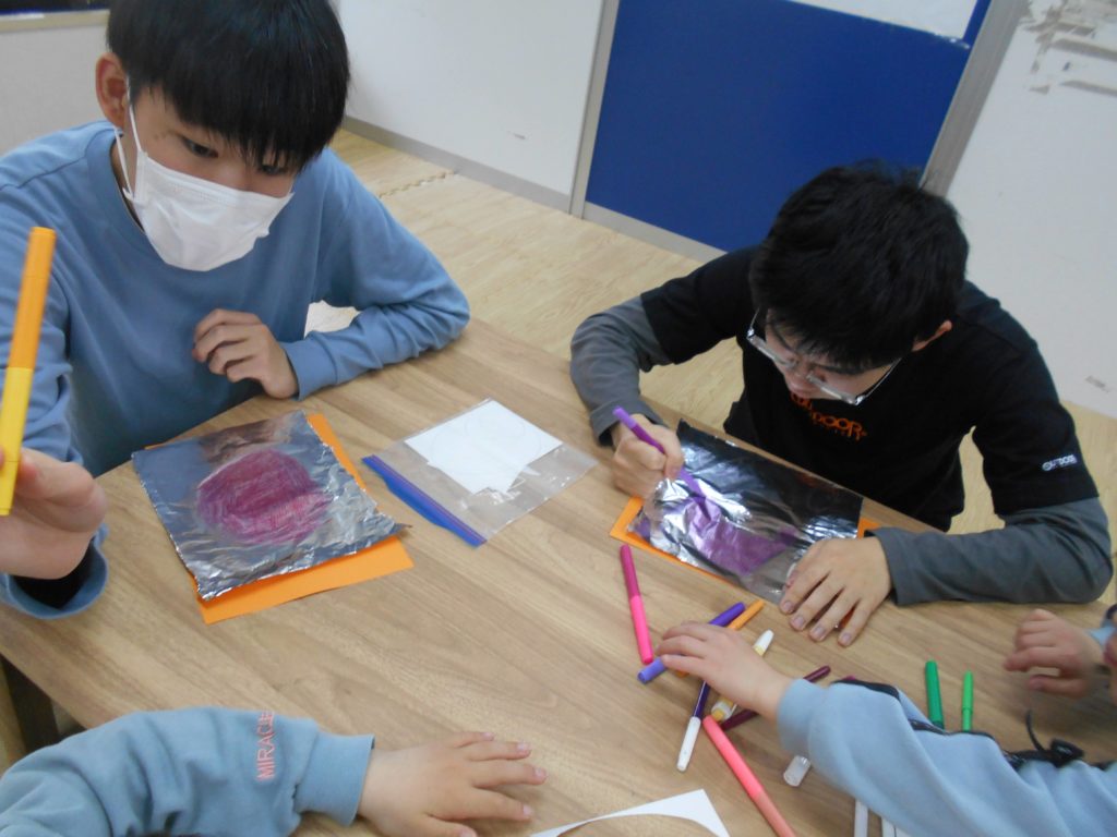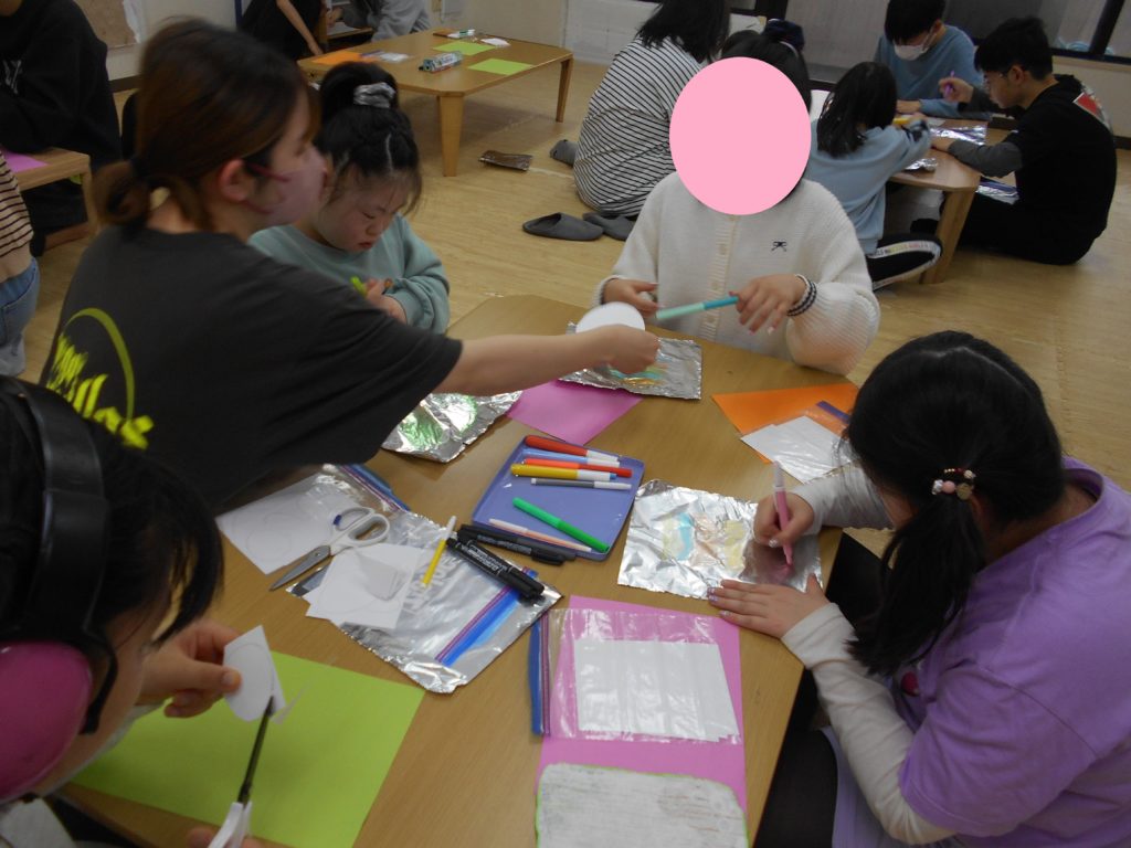 卵の殻の部分は、アルミホイルに水性ペンで色を付け、霧吹きでシュッと濡らして、画用紙を乗せて作っています🌈