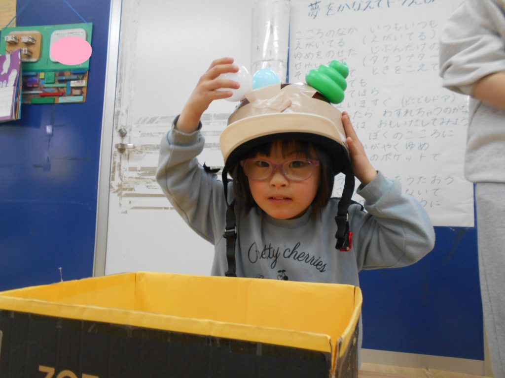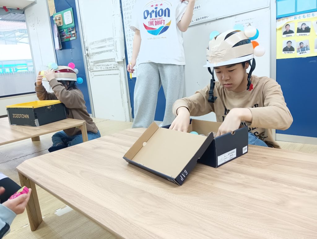 ガムテープを付けたヘルメットを装着します⛑