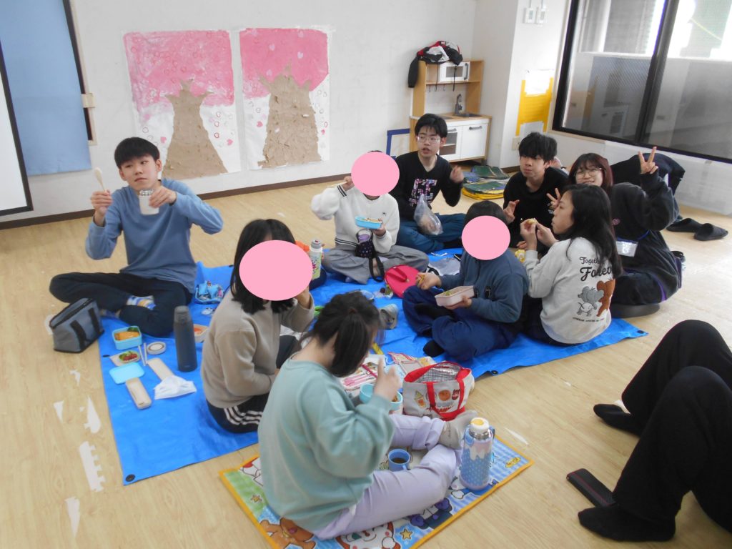 少しでも遠足気分を味わえるようにと、レジャーシートを敷いてお弁当を食べています🍱🎈